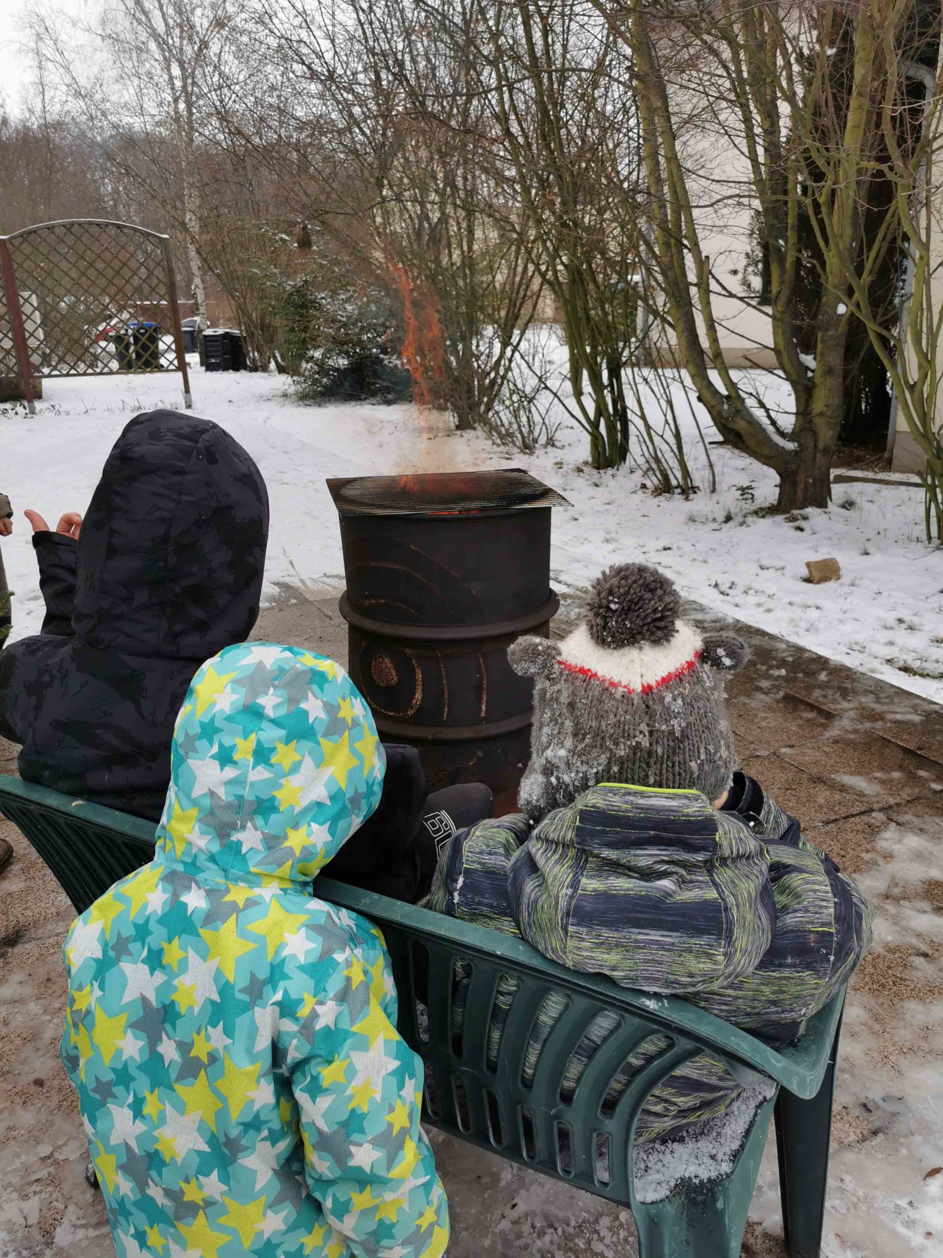 Auch der selbst hergestellte Kinderpunsch schmeckte allen Kindern und tat gut. „Unsere beiden großen Jungs hielten später noch unter Aufsicht eine Feuerwache und löschten das restliche Feuer mit dem Schnee von der Terrasse“, sagt Doreen. „Alle Beteiligten hatten große Freude an dem außergewöhnlichen Mittagsschmaus.“