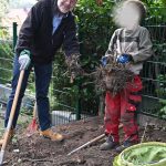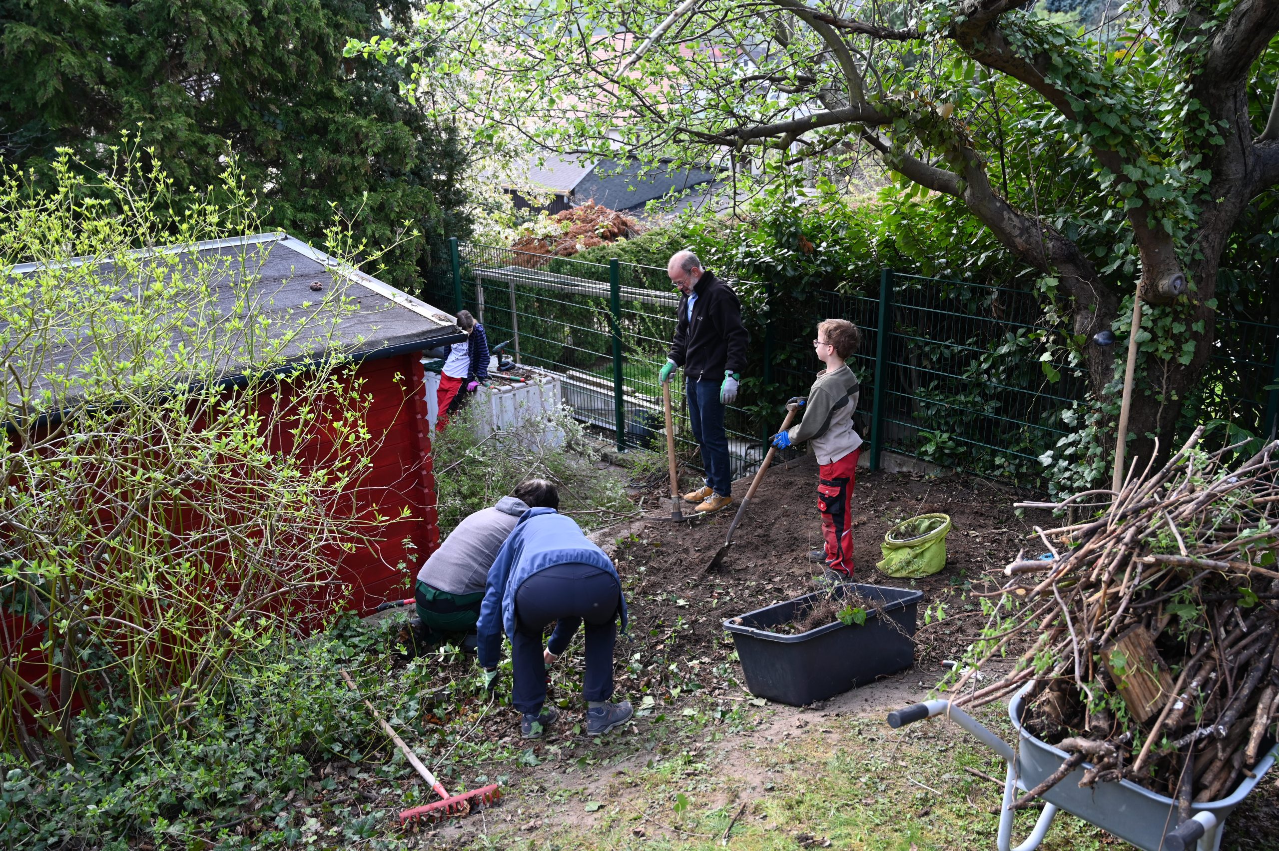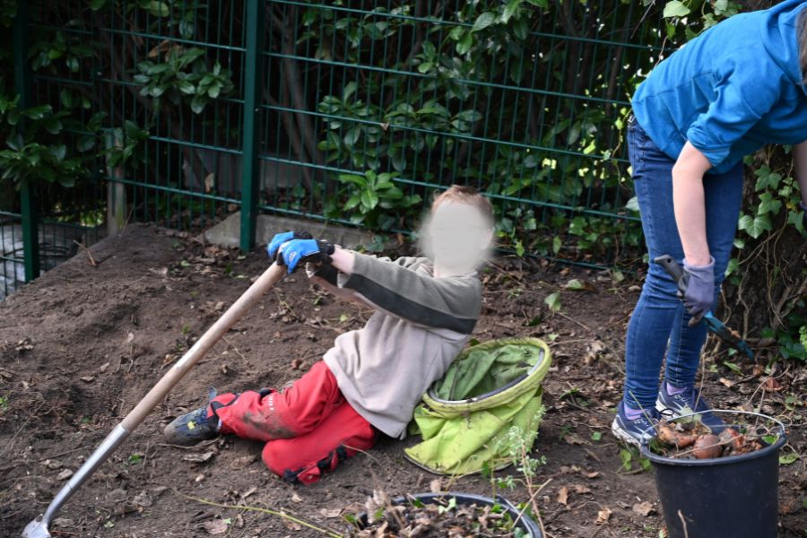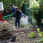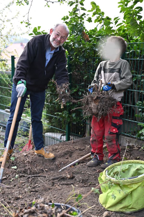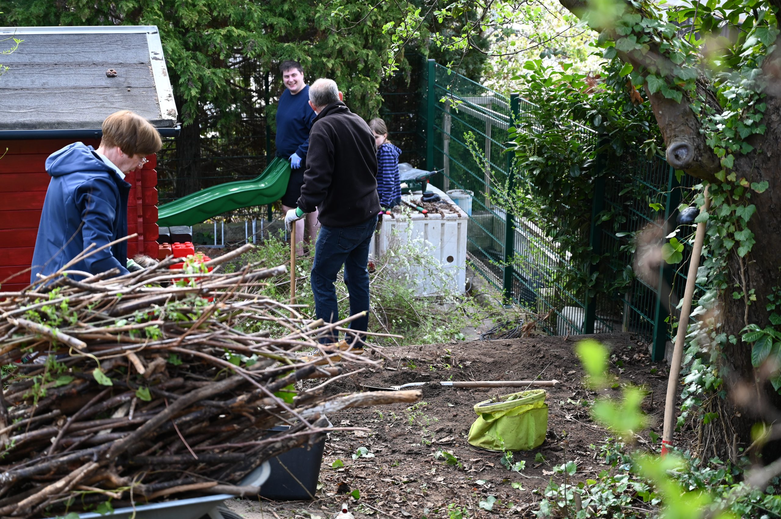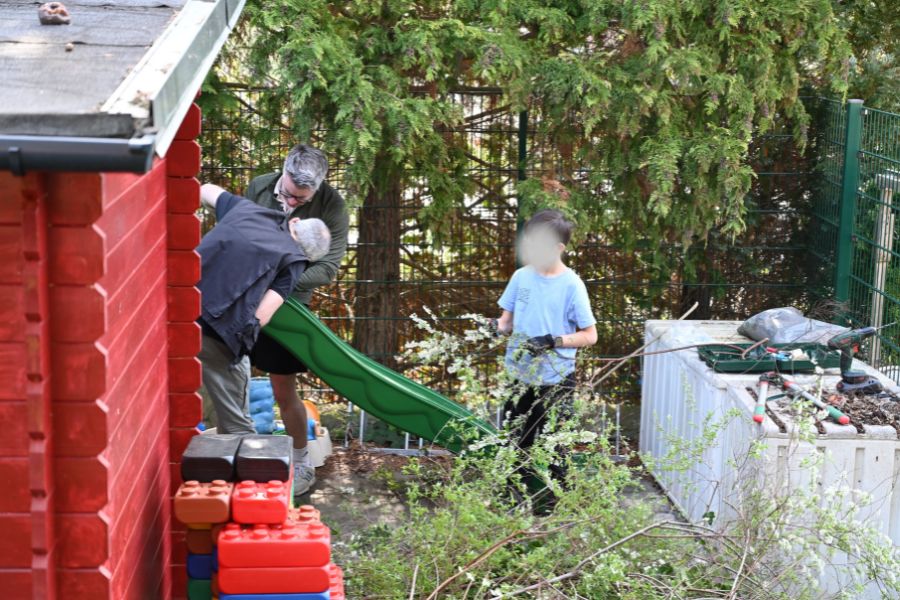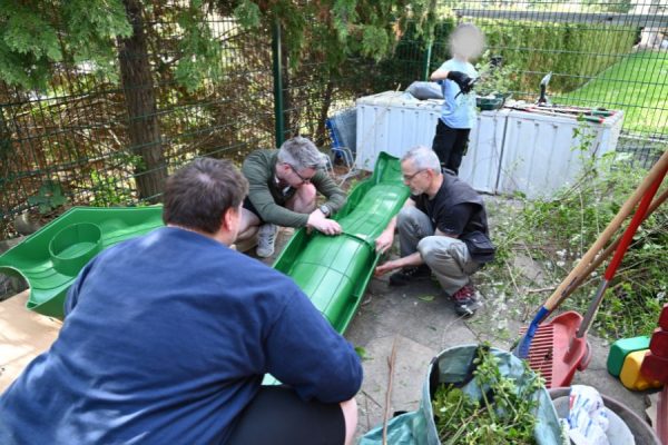 Zeitgleich wurde im Garten einer anderen Kinderdorffamilie in Dresden-Lockwitz eine neue Wellenrutsche aufgebaut. Bevor der Aufbau beginnen konnte, war zunächst echte Muskelkraft gefragt: Büsche wurden entfernt und Wurzeln freigelegt, um Platz für das neue Spielgerät zu schaffen. Auch hier waren unsere Kinder aktiv beteiligt und packten tatkräftig mit an.